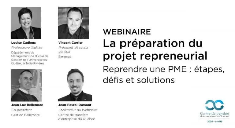 Vous êtes francophone et souhaitez vous établir au Québec en rachetant une entreprise ? Que vous viviez déjà ici ou envisagiez d’y immigrer, il est important de connaître toutes les options qui s’offrent à vous. Lors de ce webinaire, découvrez comment Repreneuriat Québec ainsi que son partenaire, Immigration CAST, peuvent vous aider à réaliser votre projet d’achat d’entreprise. À la fin de la présentation, les participants ont eu la possibilité de poser leurs questions aux experts des deux organisations.