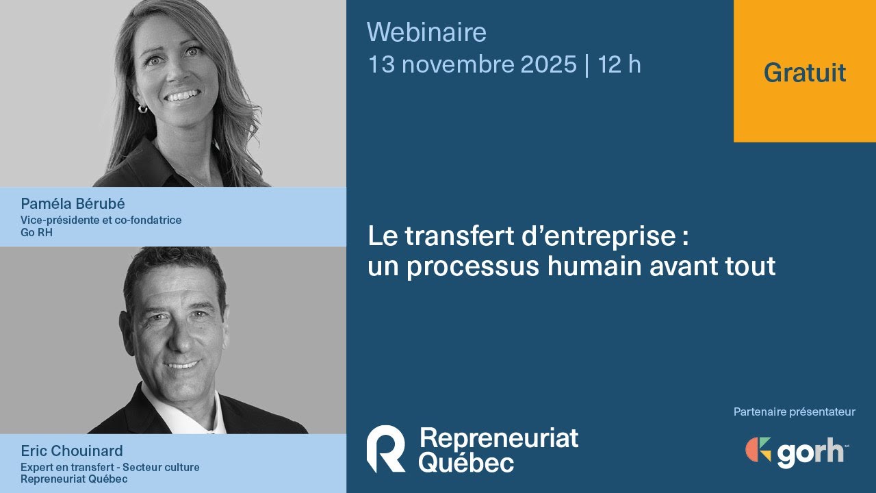 Eric Chouinard, expert en transfert d’entreprise chez Repreneuriat Québec, et Paméla Bérubé, vice-présidente et cofondatrice de Go RH, vous sensibilisent à l’importance de ces enjeux humains, de la recherche de relève jusqu’à la transmission des savoirs. Ils expliquent comment les reconnaître, les anticiper et les intégrer à une stratégie globale pour favoriser la réussite du transfert et assurer la pérennité de l’entreprise.