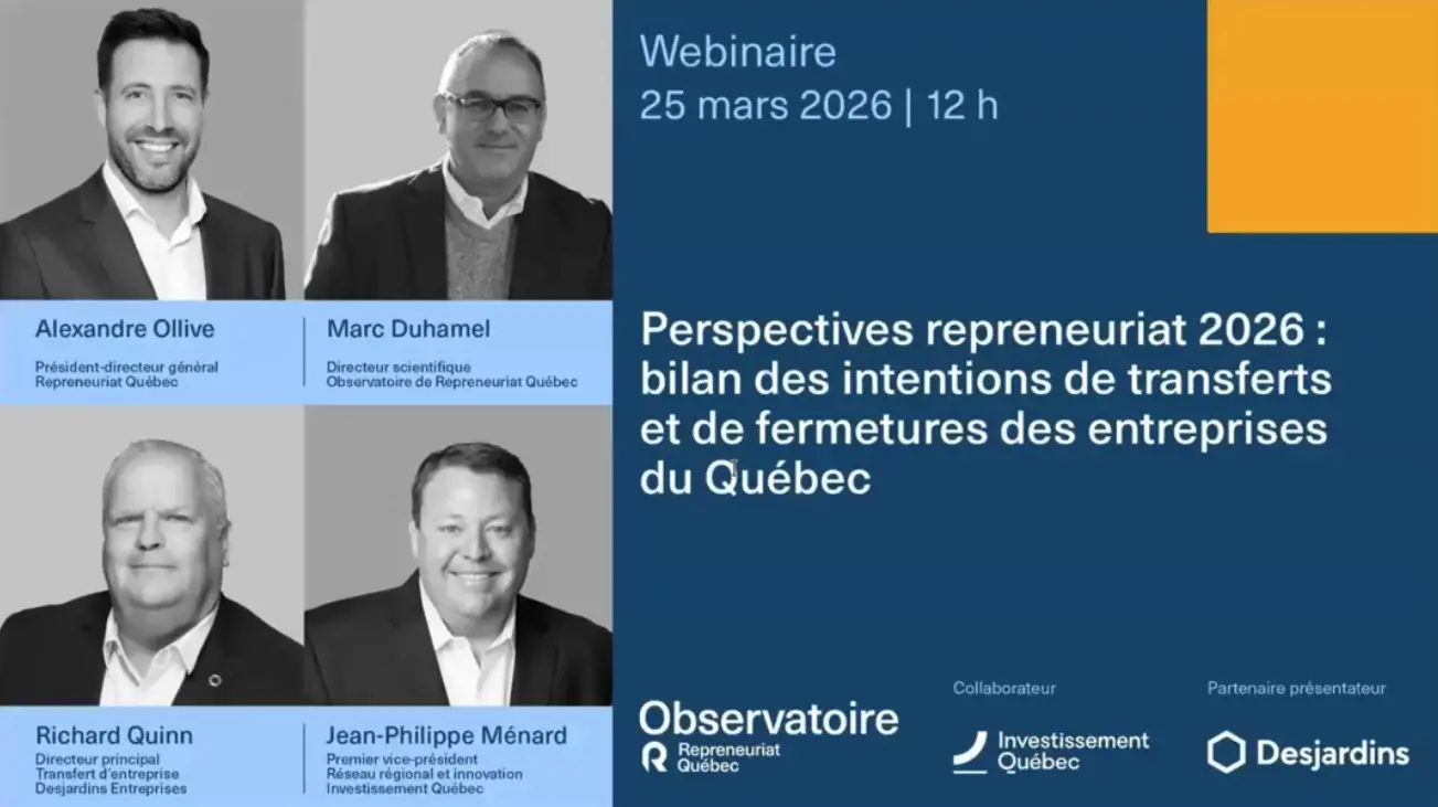Vous avez manqué le webinaire « Perspectives repreneuriat 2026 : bilan des intentions de transferts et de fermetures des entreprises du Québec » ? La rediffusion complète